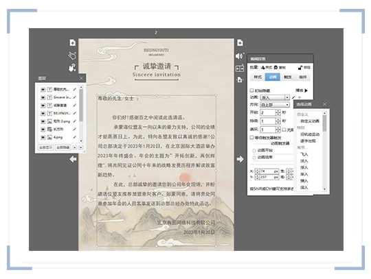 独创的时间轴设计配合简洁大方的操作界面,轻松为元素应用上百种动画效果,实时预览,简单几步便可实现您的动画创意!