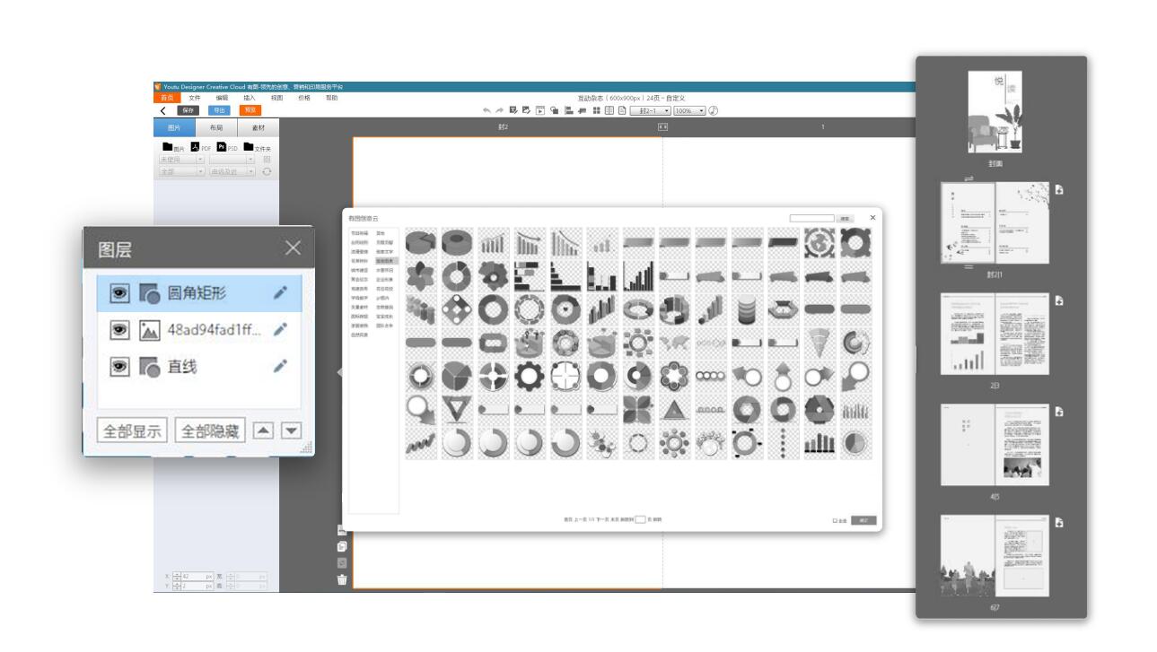 Designer Cloud 数字创意软件的形状编辑工具为您提供了一个简单的方法来创建各种不同的形状,包括线条,基本的几何形状,方程形状,箭头,标注,横幅,涂鸦,等等,也支持您上传自定义形状。