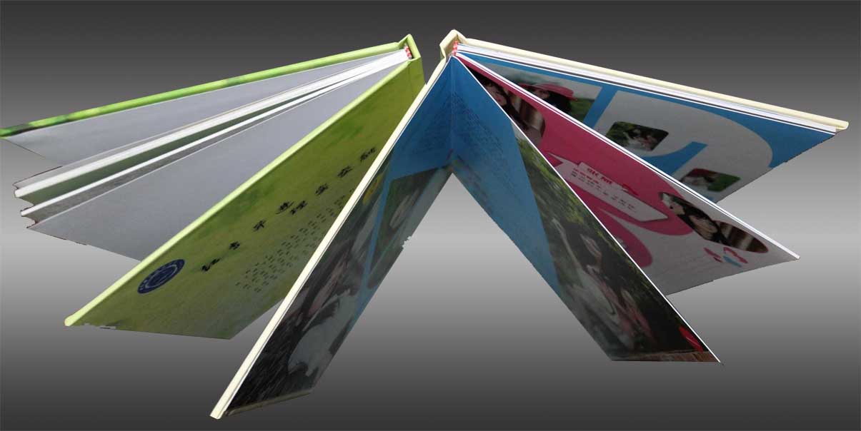 上图是两种册子展开时的对比图片。反映出两种册子的最直观区别:蝴蝶对裱精装可以180°自然展开,而普通精装是不可能这样翻开的。当然锁线精装(大批量定做时常用这种装订方式)也可以翻开成180°,但中间会有很大的缝隙,不可能进行跨页连排的。