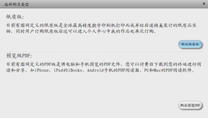 通过有图网你可以订购纸质版印刷品,也可以购买预览级PDF文件进行分享。Pdf文件可以在iphone、ipad、安卓等设备上进行阅读。