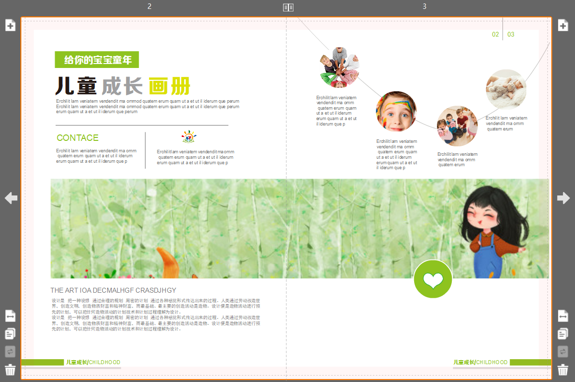 在一个画册式的版面中,如果包含有几张照片,照片要错落有致地排列,并且不要太大,要小而精致,体现出画册的感觉。